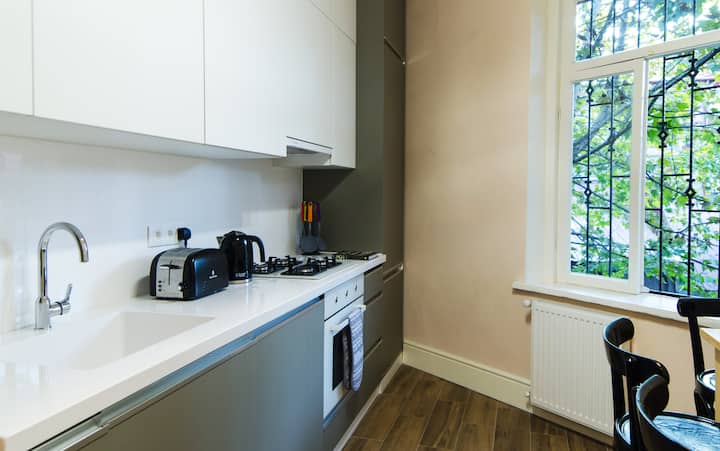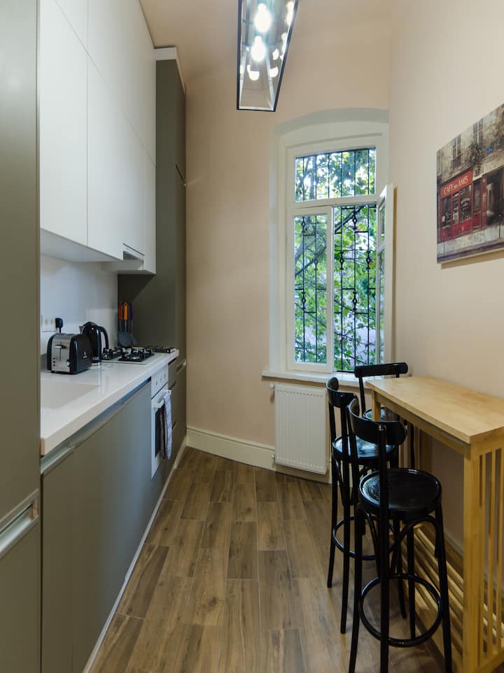 Преди няколко години закупихме имота в сърцето на Тбилиси, в който се влюбихме толкова много, като Виктория(дизайнер)и моето аз(архитект)- вложихме толкова много душа и сърце, за да запазим възможно най - оригиналния стил на къщата. Силно вярваме, че това ще бъде приятна дестинация, за да могат хората да дойдат, да се насладят и да имат почивка в града в прекрасния ни ваканционен дом.