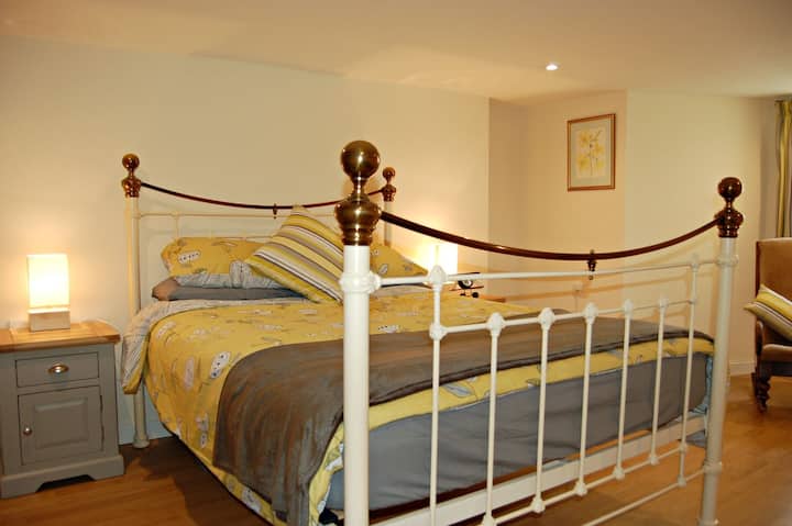 С под за килими, двойно месингово легло, 2 х 3 борова нощна масичка и лампи, голям 4 чекмеджета с чекмеджета в координиращата борова дървесина. Голям прозорец отзад. Леглото разполага с подвижна релса за легла, която гостите с проблеми с мобилността могат да използват. Висяща релса в шкафа
