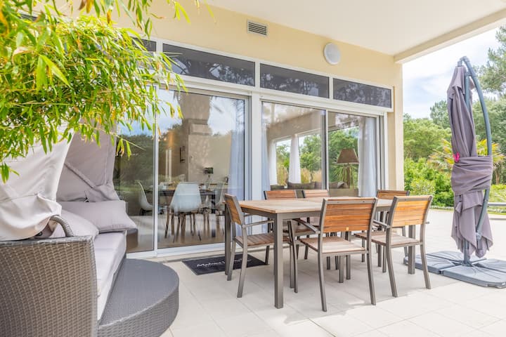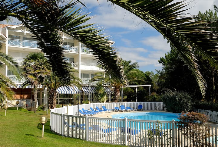 Избягайте в нашето очарователно и слънчево уединение от 63 до 81 м2 в Молиет, идеално разположено в 17 - та дупка на едно от най - добрите голф игрища във Франция! Очарователният и вълнуващ център на града е само на 3 км, където ще намерите вкусни ресторанти, вълнуващи атракции и модерни магазини и бутици. Наслади се на красивите гледки към гората Ландес от този район, както и близките плажове. Нашият удобен и обзаведен с вкус апартамент разполага с големи прозорци и е напълно оборудван за вашия комфорт. Горещо ви препоръчваме да се насладите на слънцето на самостоятелната си тераса или балкон след ден до плажа или на голф игрището!