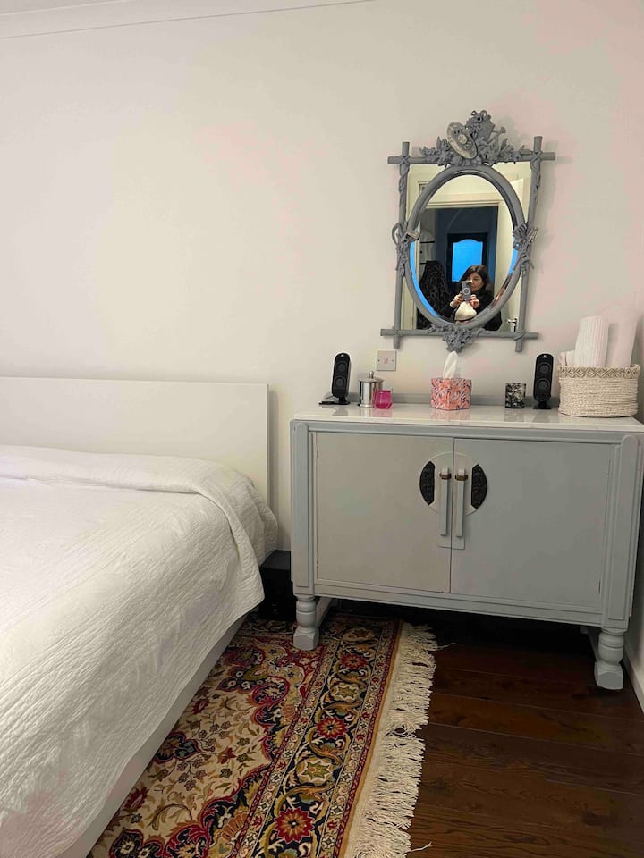 Спалня със собствена баня в апартамент с градина в Белсайз Парк