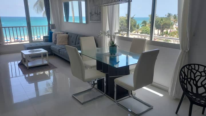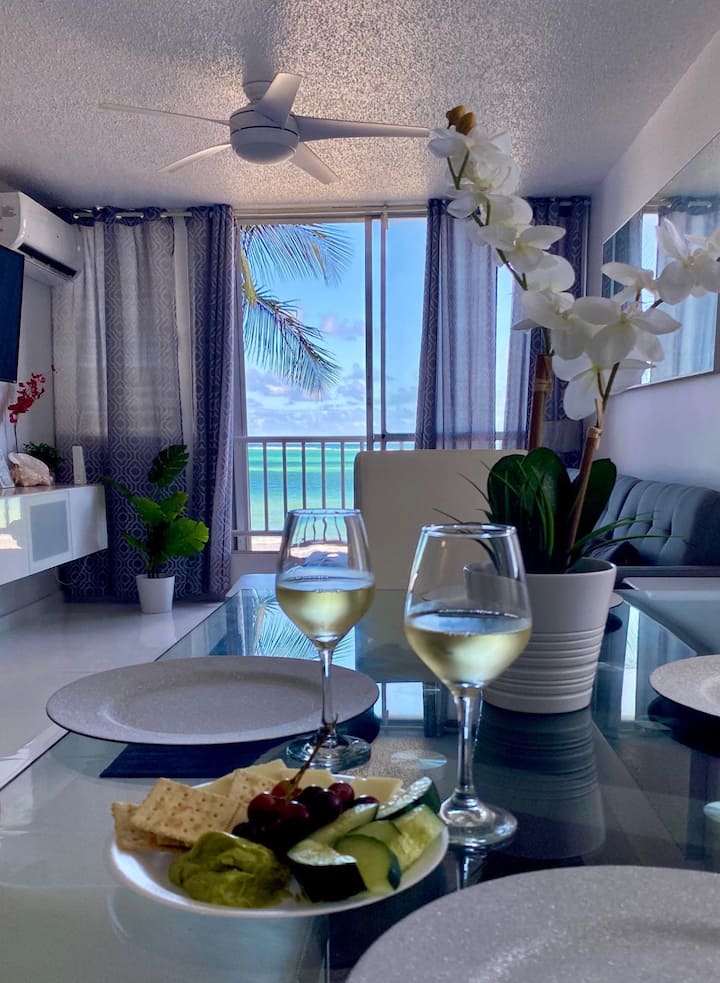 Бриз, невероятен изглед към океана с изглед към плажа с една спалня С големи стъклени плъзгащи се врати в спалнята и всекидневната, от които се разкрива изглед към плажа! Удобно и трансформиращо се! Модерни мебели, трапезария за 4 души. Изцяло бяла ремонтирана кухня и баня.!!
