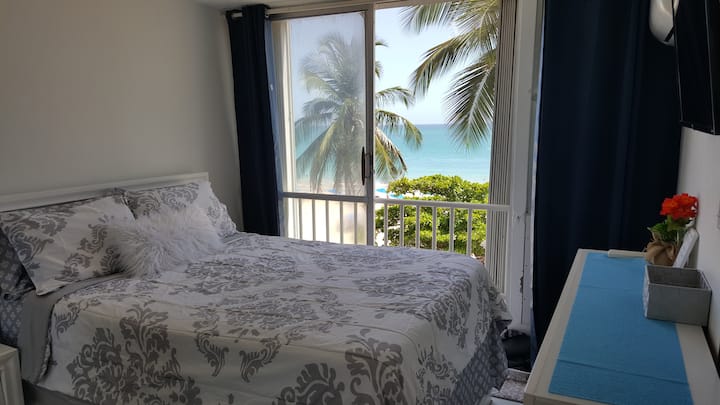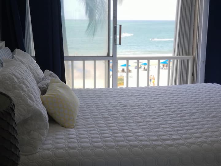☆Спалнята има меко удобно двойно легло с допълнителен матрак, водоустойчиво/хипоалергенно покривало, меки чаршафи, юрган, нощно шкафче, скрин, вентилатор на тавана, 43-инчов смарт телевизор с Roku, Wi-Fi/интернет и антена, врати на гардероба с голямо огледало. Големи стъклени плъзгащи се врати, които се отварят директно към гледката към плажа!