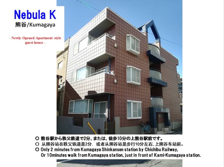 Открихме частно жилище в апартамент само на 2 минути от гара Кумагая на железопътната линия Чичибу пред железопътната линия Чичибу, за да позволим на хората по целия свят да видят очарованието на родното място на Кумагая, живописния район на Сайтама и богатата природа на Чичибу във всеки от четирите сезона.Ще останем не само, но и ще предоставим местна информация и информация за живописните места.