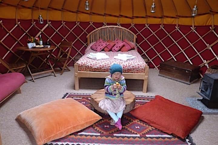 Държавата има 3 юрти с истински легла, печка на дърва и собствени готварски съоръжения. Кутии за охлаждане и лед, осигурени за охлаждане на храната и напитките. Извън всяка юрта има камина, барбекю и маса за пикник, както и тоалетна за компост. Споделен слънчев душ и юрта за баня, с топла вода, снабдена със специално проектирана печка на дърва. Пералня и сушилня за употреба, ако е необходимо. Съоръжения за рециклиране и миене. Люлка на дървета, хамаци, хладка линия и материали за ден - сграда в гората. Няма автомобили на място, така че количките са предоставени, за да се носят чанти на краткото разстояние до юртите. Сесиите за противопожарно осветление и други умения за занаяти, управлявани от напълно квалифициран инструктор, могат да бъдат резервирани отделно.