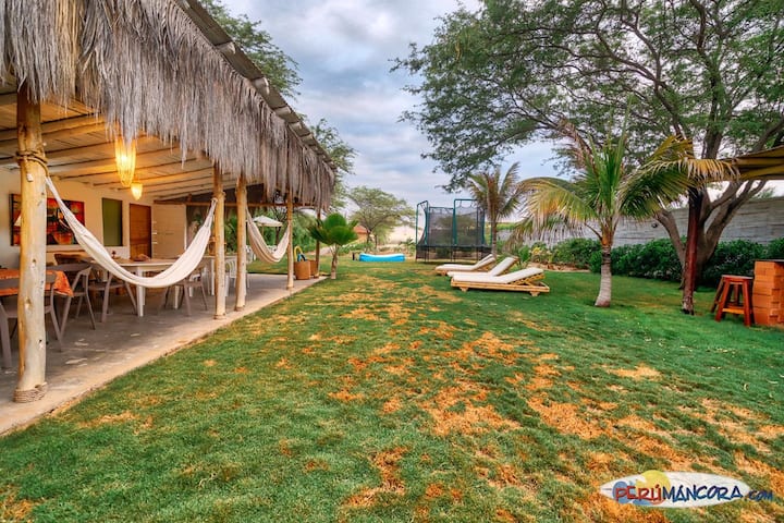 Съответства от 1 къща на плажа на 45 метра от морето. Парцелът е ограден и на първия ред. От 1 до 11 души (4 стаи), построени с материали от северната перуанска бастун, бамбук и палма на едно ниво на земята от 1600 м2 в частен жилищен блок. Отпуснете се със звука на морето и се насладете на брега на няколко метра от леглото си. Много селски, естествен, удобен, семпъл, чист и самостоятелен и самостоятелен