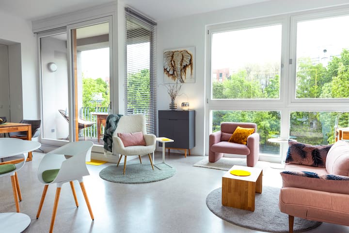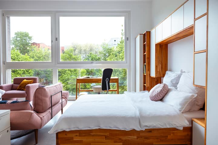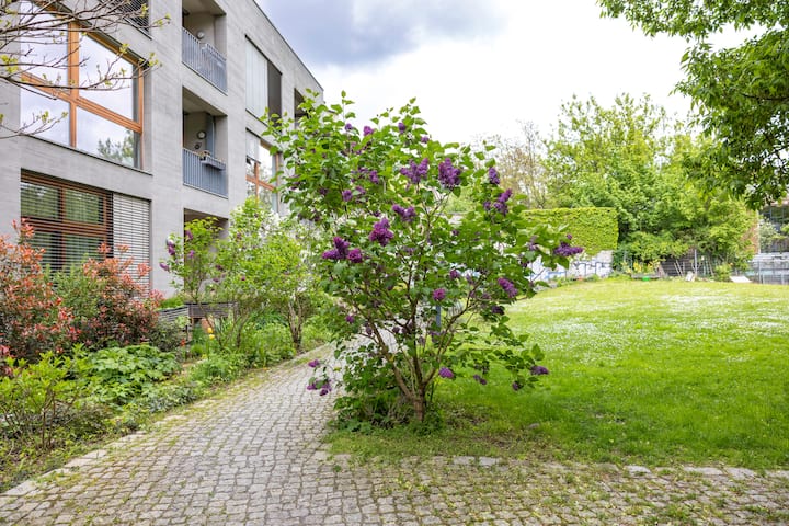 Светло, висок таван, изглед към градината