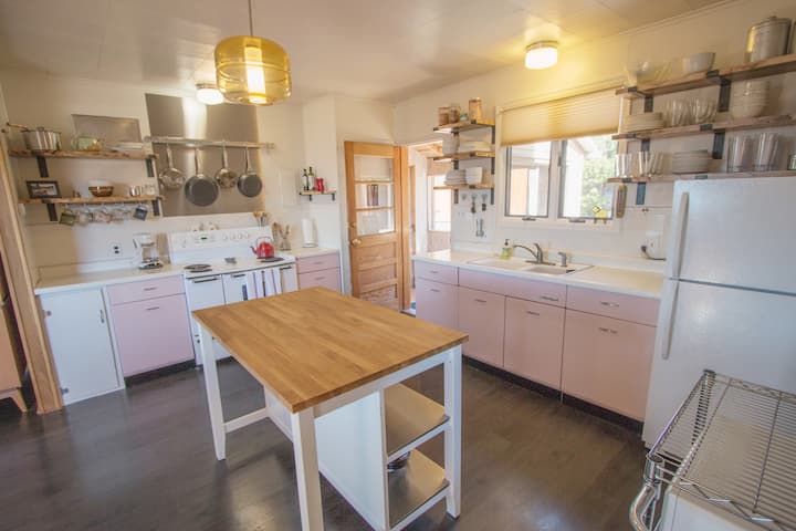 * Положихме големи усилия, за да се уверим, че кухнята е добре снабдена по отношение на тенджери и тигани, съдове (включително малък запас от детски съдове), уреди и прибори за готвене, както и почистващи препарати, сапуни, филтри за кафе, хартиени кърпи, олио за готвене, подправки и сол/пипер. Обичаме да готвим и печем, така че кухнята ни е предназначена за хора, които също обичат да готвят и пекат. Имаме миксер, ръчен миксер, блендер, кухненски робот, микровълнова печка, бавен котлон, грил George Forman, машина за пуканки и чайник, традиционна кафеварка, машина Keurig и френска преса, както и кафемелачка. ЕДИНСТВЕНОТО НЕЩО, КОЕТО ЛИПСВА в кухнята, е СЪДОМИЯЛНА МАШИНА. Все още я включваме във фантастичните ретро шкафове от 60 - те години. Имаме пропанов грил точно пред кухненската врата.