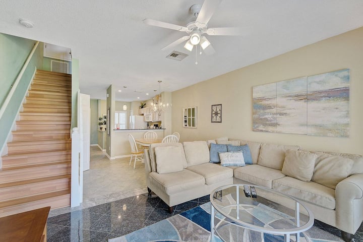 Предлагаме двуетажен градски дом с определен паркинг, 2 спални и 2,5 бани. Резервирайте днес и се насладете на прекрасна напълно заредена отворена кухня с по - нови уреди, гранитогрес, хладилник с достъп до входната врата, стъклен котлон и фурна с вградена микровълнова печка и много съдове, за да приготвите любимото си ястие с морски дарове за цялото семейство по всяко време. Има маса за хранене за 4 - ма души точно до кухнята с подови настилки от плочки за лесно почистване. Тоалетна наблизо за ваше удобство.