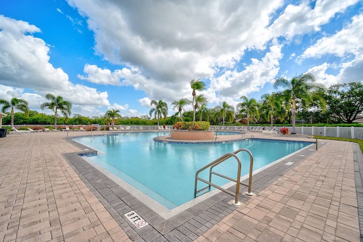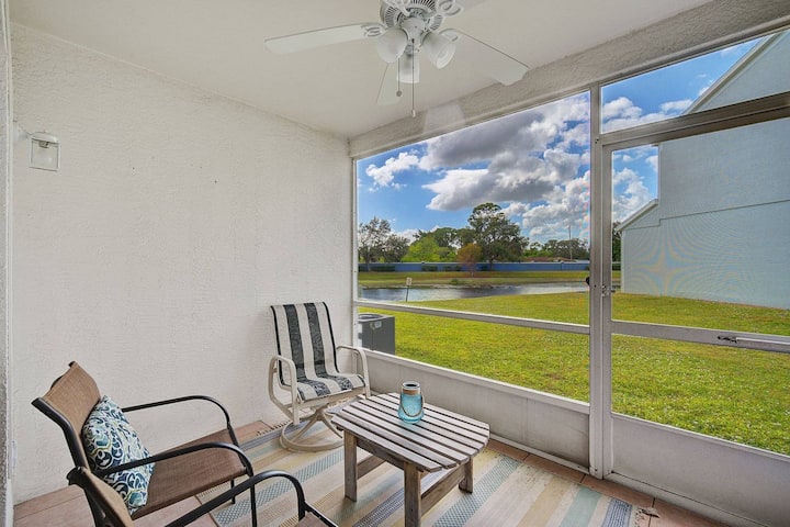 В трапезарията има килер с пералня/сушилня в пълен размер за ваше ползване. От откритата трапезария има просторна всекидневна с мраморен под, удобен ъглов диван, който позволява на всички да гледат любимото ви шоу заедно на 55 - инчовия плоскоекранен телевизор, монтиран на стената, с кабелна телевизия и Wi - Fi. Плъзгащите се врати се отварят към проверения ланай, където можете да се насладите на сутрешното си кафе с изглед към малкото езеро. Изобилие от слънчева светлина, за да започнете деня си правилно!