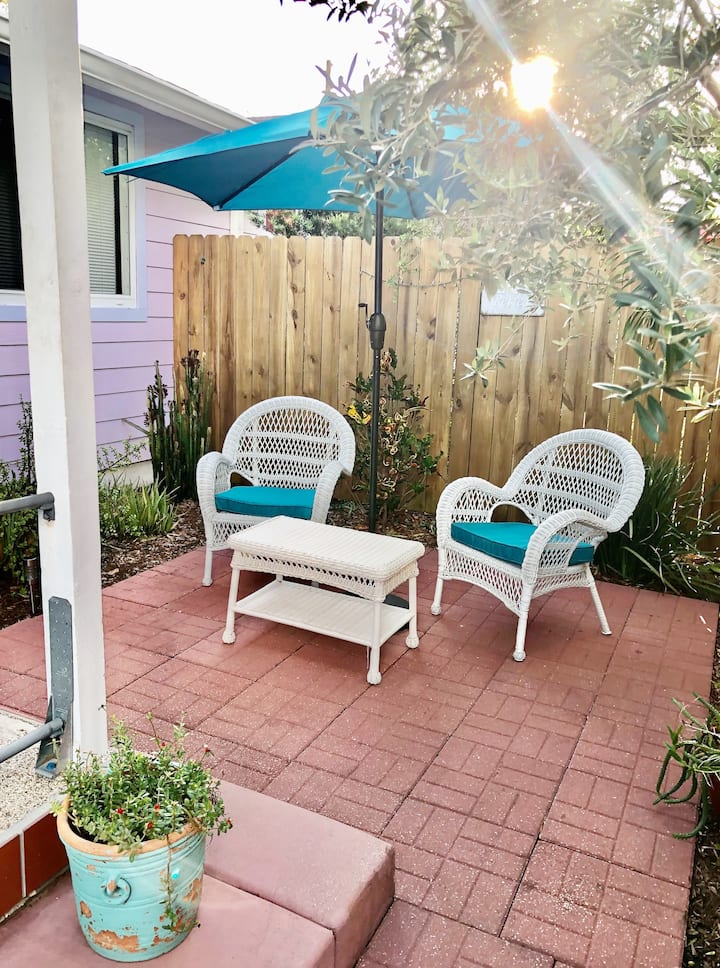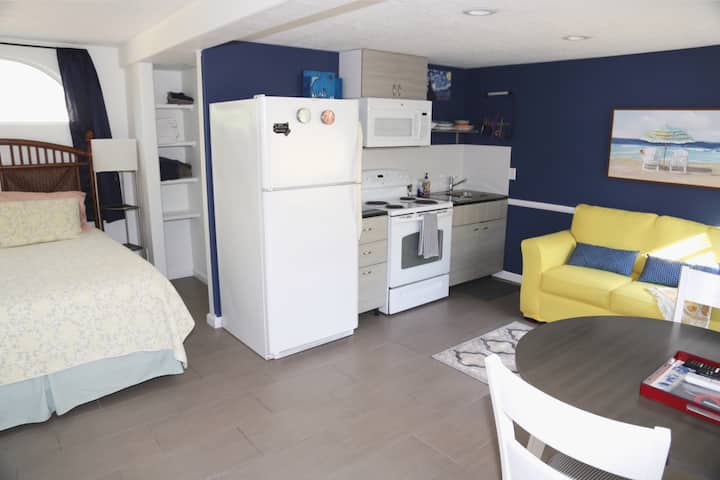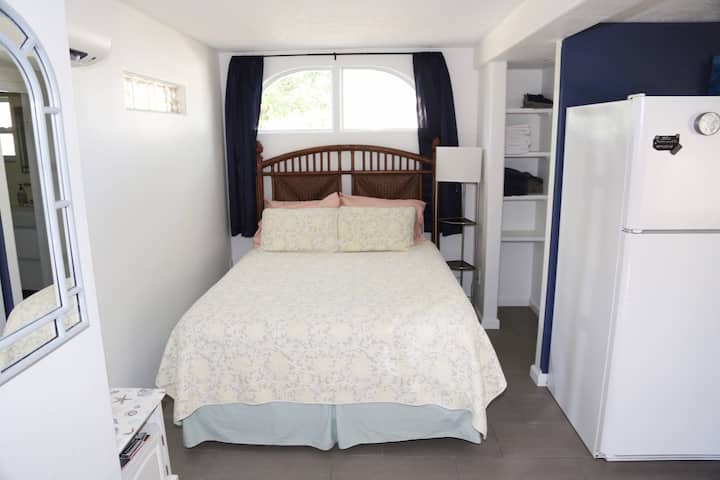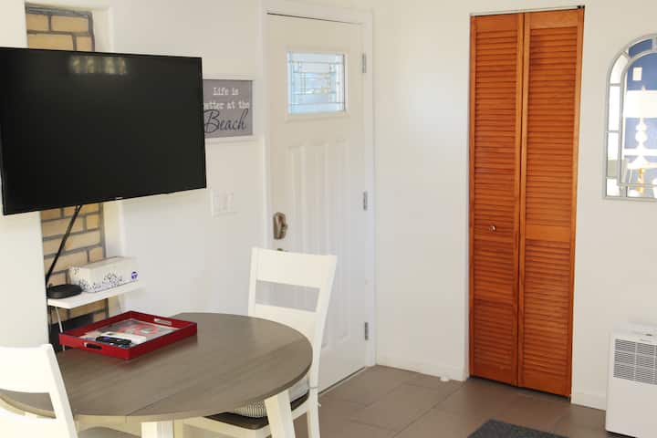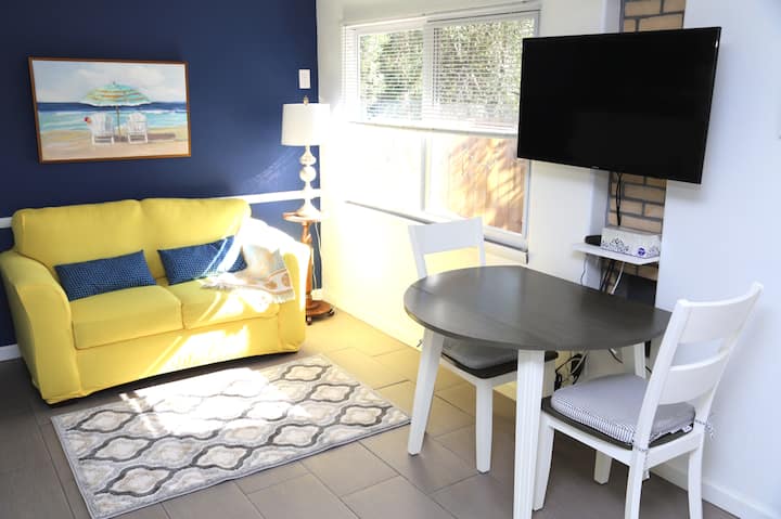 Гарсониера, разположена в тих квартал. Апартаментът е сгушен в задната част на частна резиденция. Ще имате кратка разходка до забавни магазини, отлични ресторанти, музика, танци и селския плаж! Напълно оборудвана кухня, удобно двойно легло, дрешник, баня с вана и душ, 100mb Wi - Fi, 40 инча телевизор w/Roku дистанционно. Отделен вход с безплатен паркинг на сенчест навес. Собствен вътрешен двор, в който да се насладите на сутрешното си кафе! Без домашни любимци или деца.