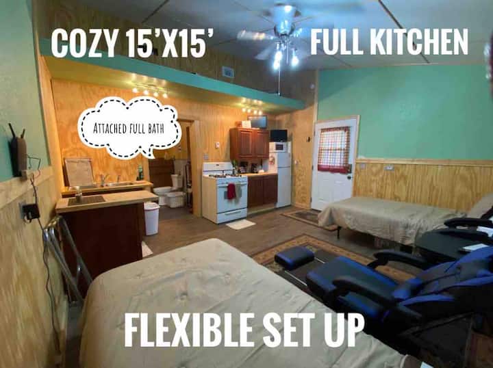 Това е МАЛКО студио... само 15'x15', с прилежаща пълна баня, но аз съм включил много удобства в това малко пространство, включително пълна кухня.