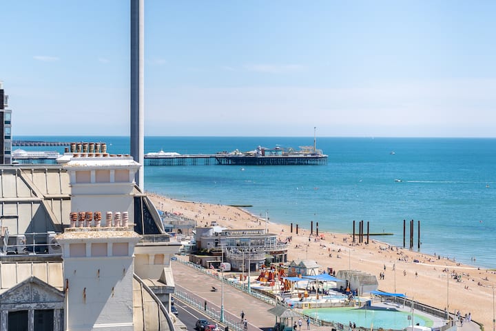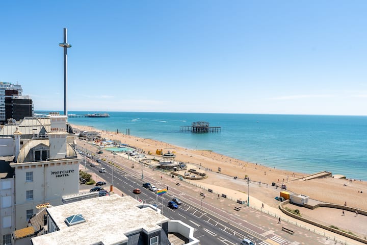 Какво удоволствие предлага този пентхаус. Невероятна гледка към брега на Брайтън и Хоув, плаж и градски пейзаж от всички стаи. Седнете в леглото и ето ви там. Спокоен оазис на желаното, Kings Road, този апартамент е идеален за хранене, пиене, театър, плажен живот, пазаруване и нощен живот и всичко, което градът може да предложи, и всичко в рамките на кратка разходка. На разумна цена може да има и паркинг на място, просто помолете да резервирате. Защо да дойдете в Брайтън и да не видите морето?