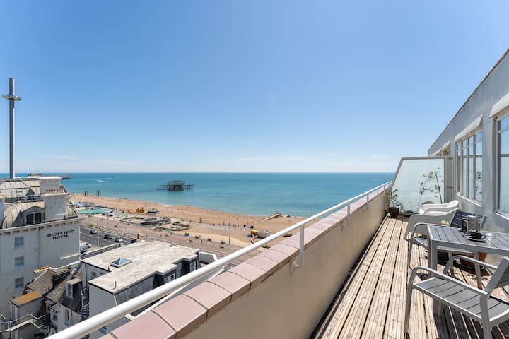 Предлагайки забавно и свежо усещане през цялото време, апартаментът разполага с дълга самостоятелна слънчева тераса, в която можете да се насладите на директна гледка към морето и плажа пред Брайтън. Толкова е хладно да се наслаждавате на гледката или просто да се наслаждавате на гледката и да се наслаждавате на радост в зависимост от настроението си. Няколко коктейла точно в края на деня и светлините на Брайтън започват да се запалват, но не оценявам, ако искате да започнете с „Блъди Мери“ на закуска, тогава направете го!