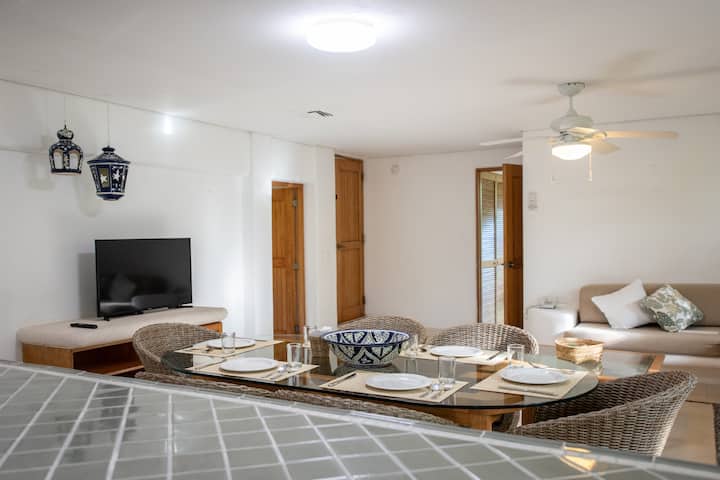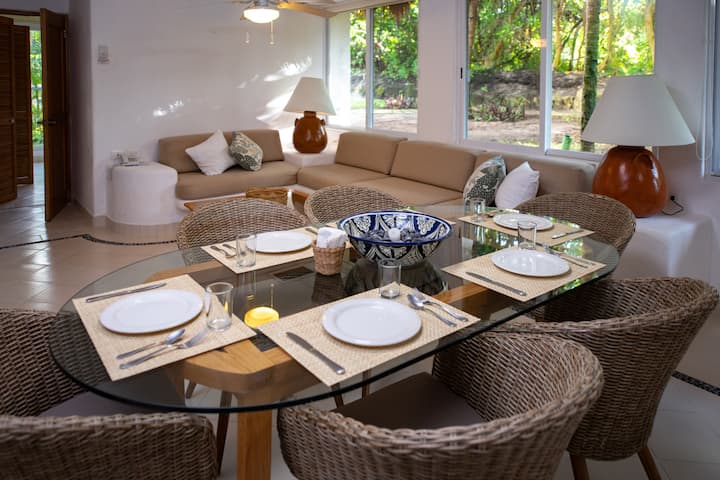 Живейте като местни жители и изследвайте всеки ъгъл на Ривиерата на маите от вилата си на брега на морето в частен естествен рай. Вилата ви има всичко необходимо, за да ви накара да се чувствате като у дома си, напълно оборудвана кухня, трапезария и всекидневна, баня във всяка стая, сешоар, безплатен Wi - Fi, смарт и сателитна телевизия, телефон и сейф, централен климатик и вентилатори на тавана. Това помещение няма тераса или гледка към морето, но плажът и басейнът са буквално пред вратата ви.