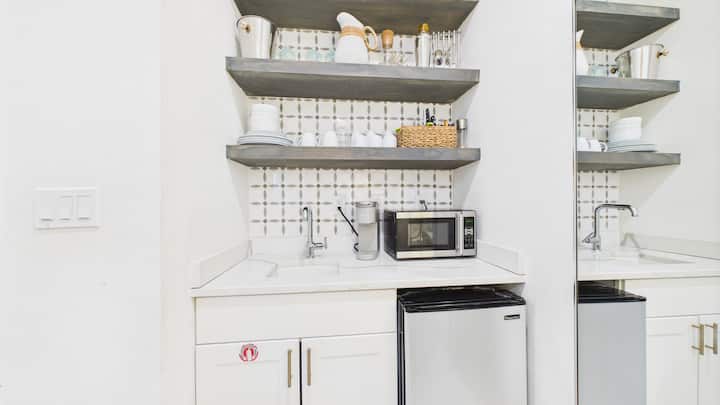 Нашият апартамент-студио с площ 325 кв. фута е добре проектиран и използва ефективно пространството. Кухнята е добре заредена с кафемашина Keurig, тостер фурна Kitchen-Aid, микровълнова фурна, тенджери, тигани, чинии, прибори за хранене, прибори и Tupperware.