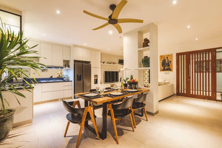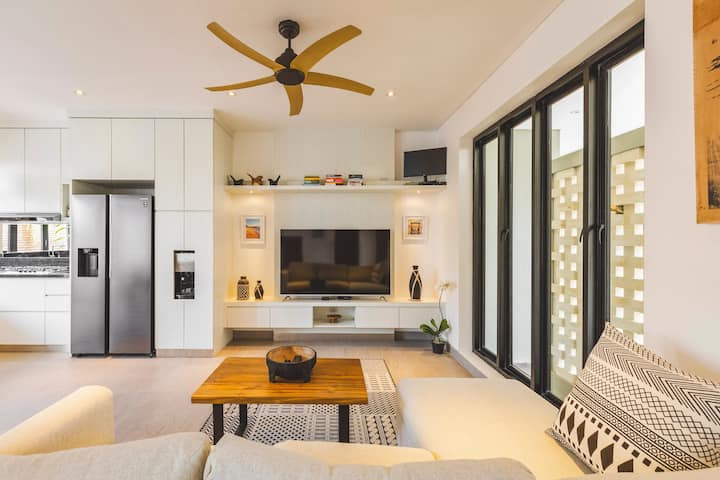 Чисто нова вила с 3 спални и затворена всекидневна, напълно оборудвана кухня и обзаведена с вкус от известни местни художници.