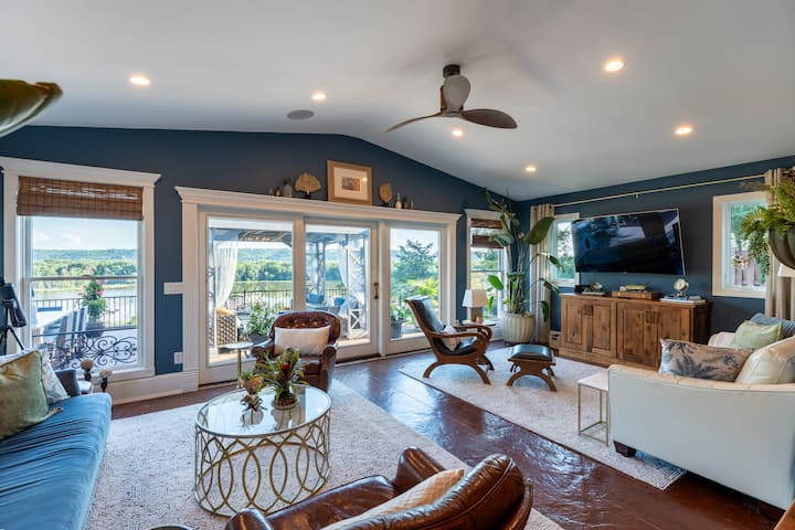 Отвън магията продължава. Вътрешният двор има гледка към долината на река Мисисипи – идеално за кафе при изгрев слънце или вино при залез слънце. Орлите се реят над главите ви, а мигриращите пеликани се събират на стотици през пролетта и есента. (Телескопът ни е готов, ако искате да погледнете по-отблизо!)