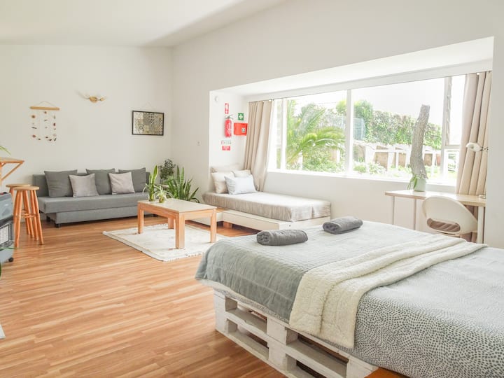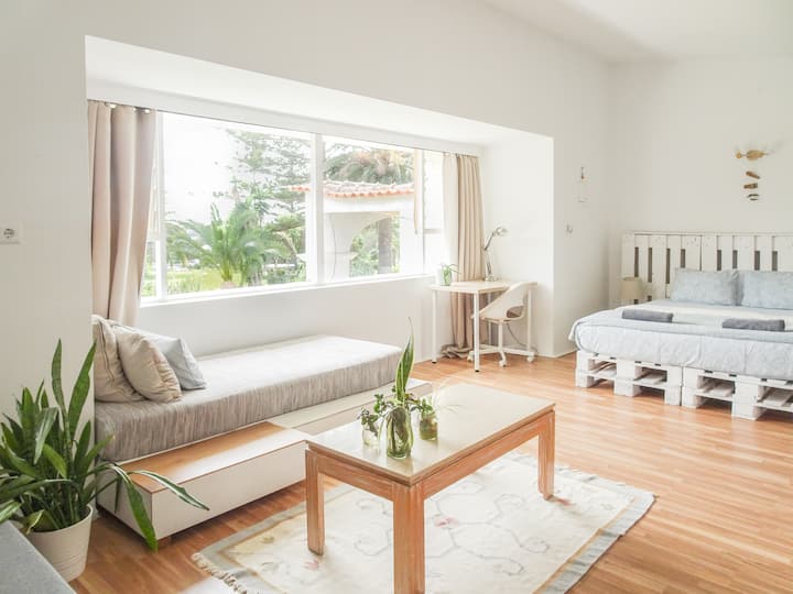 Това светло и просторно студио предлага спокойно място за отдих с големи прозорци, които показват просторна гледка към градината, наводнявайки стаята с естествена светлина. Гостите имат достъп до огромни градини с голям басейн, специална зона за упражнения и спокойни езера. Идеално за двойки, работещи професионалисти или малки семейства, студиото е обзаведено с удобно двойно легло и два дивана, всеки от които се превръща в допълнителни легла, в които могат да се настанят до четирима гости.