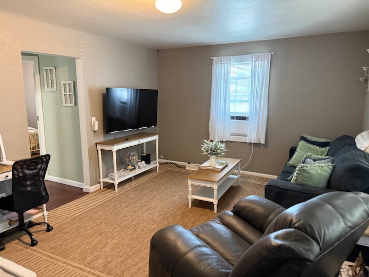 Има 55-инчов телевизор с плосък екран с включени NETFLIX и HULU! Граничен достъп до интернет. Също така имаме разнообразие от настолни игри за незабравимо време със семейството! Тази къща има ОГРОМЕН напълно ограден заден двор, на който да се насладите с децата си, а вечер да наблюдавате спокойно звездите. Има скара за барбекю с пропан и хубава маса за пикник, на която да се насладите. Разходете се до близките местни магазини, ресторанти, кафенета и красивия ни съд.