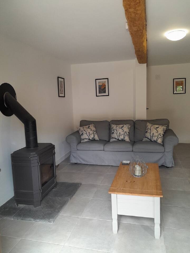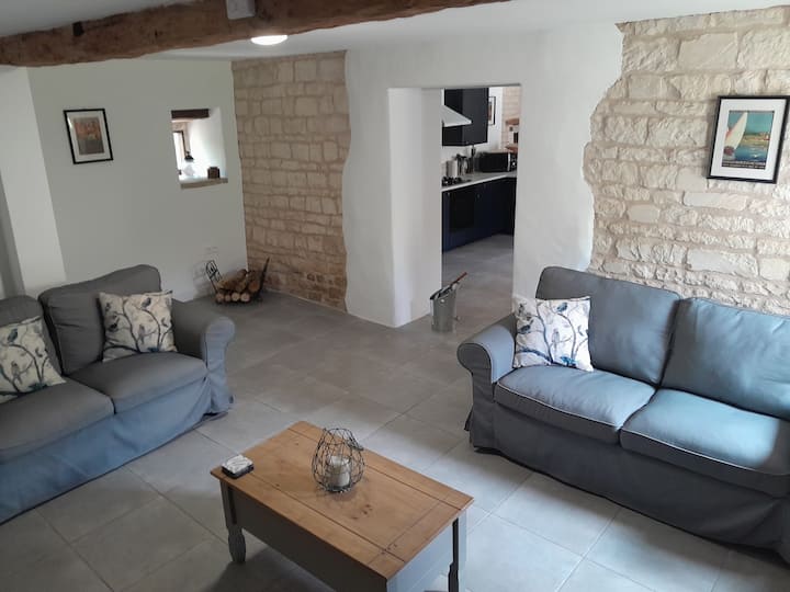 На долния етаж има удобна всекидневна с дървена печка, водеща към кухненска закусвалня с всички необходими удобства. Има и тоалетна на долния етаж за ваше удобство. На горния етаж има семейна баня с душ и 3 спални, в които могат да се настанят до 6 души, с изглед към вътрешния двор или френската провинция. Можете също да се насладите на безплатен WI - FI и френска/английска телевизия. Спално бельо, кърпи/кърпи за басейн се предоставят безплатно.