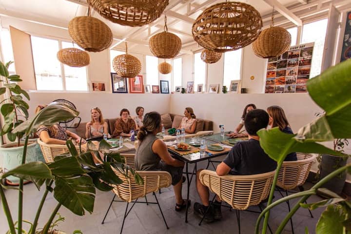 Покривът ни е рядка находка – с красиви гледки и успокояващите звуци на града отдолу. Очакват ви пет елегантни стаи с баня и климатик, които съчетават традиционния марокански стил с модерния комфорт.