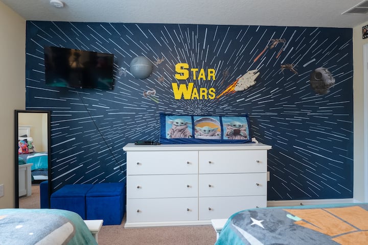 Приключенска 🎮 СПАЛНЯ в спалня с 3 звезди: изживейте силата в нашата тематична спалня „Междузвездни войни“ включва 2 единични легла, заедно с 42 - инчов смарт телевизор Roku с кабелна телевизия. Тази спалня е идеална за вашите млади джедаи или фенове на емблематичния филмов сериал, които искат да изживеят приключението на галактиката далеч, далеч. LED осветлението с дистанционни управления е разположено около двата стенописа. Включете ги и създайте космическо настроение.