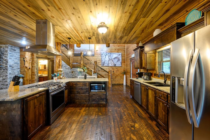 Докато влизате в тази прекрасна дървена колиба, влизате в големия отворен план на етажа. Първо, просторната кухня с всеки уред, от който се нуждаете, за да приготвите всяко ястие или лека закуска за престоя си. Големи броячи, красива мивка в хамбара и уреди от неръждаема стомана.