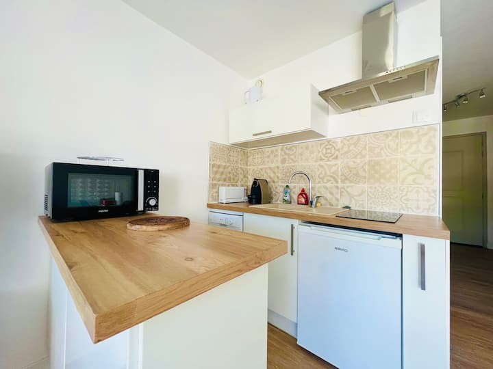 This two-room apartment has modern comfort, including a washer wash and an equipped kitchen as well as air conditioning.