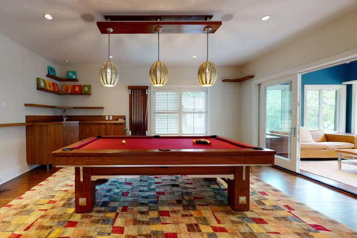 -2 двойни спални с бани, зала за тренировки и стая за развлечения, подходящи за филми или детски игри с маса за въздушен хокей и игри. Разходете се до басейна.