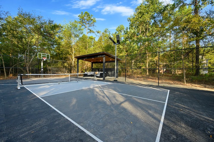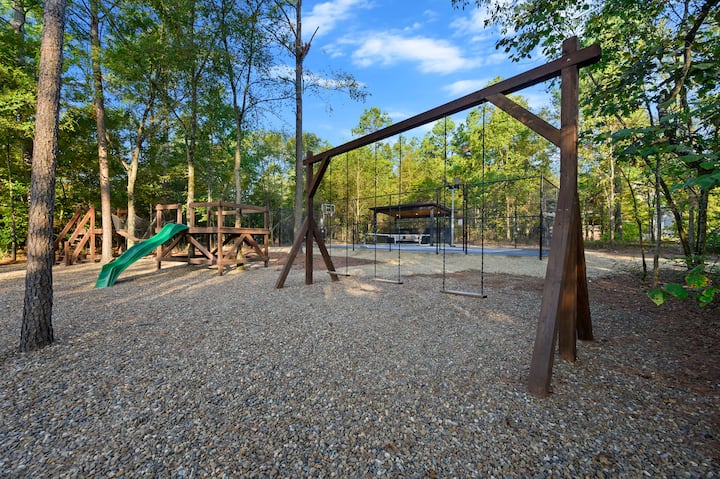 Отвъд терасата, разгледайте удобствата в курортен стил на имота, включително частен корт за пикълбол, баскетболна зона и покрита беседка с удобни мебели за сядане за гледане или релаксация между игрите. Спуснете се до специално създадения детски игрален комплект или се съберете около огнището, заобиколено от столове „Адирондак“, където смехът и историите изпълват въздуха. С ямите за хвърляне на подкови, откритите пространства и зашеметяващата гледка към кристално чистия поток, Streams & Dreams предлага несравнимо изживяване на открито, където всеки момент е едновременно спокоен и незабравим.