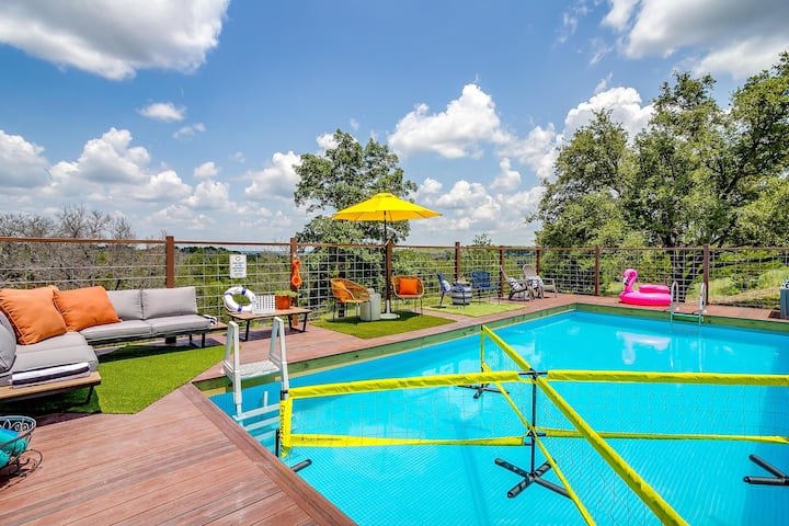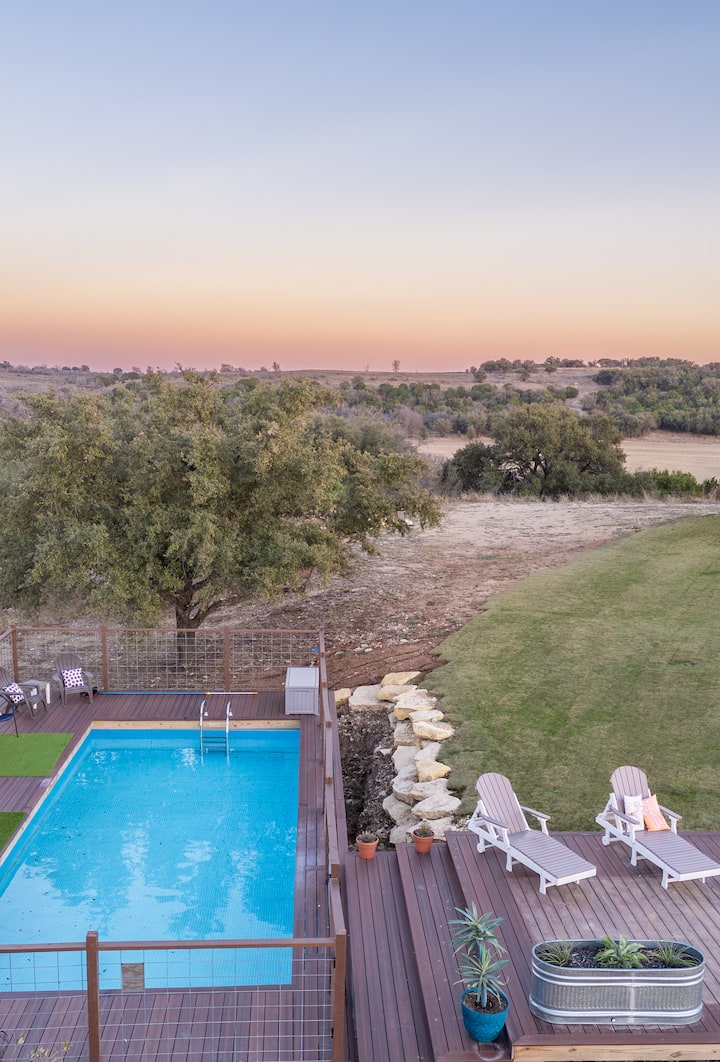 Открийте собственото си място за отдих от 34 акра в ранчото Skyview, разположено между Гранбъри и Глен Роуз. Насладете се на ексклузивен достъп до 5 самостоятелни вили, 3 уютни хижи, просторна зала за събиране, 32 - инчов басейн, спа център за хидро плуване, заредено рибарско езеро, пешеходни пътеки, огнища, игрална арена, зони за хранене на открито и др. Skyview Ranch може удобно да настани 30 гости, така че е идеално за групови почивки, семейни почивки или празненства с достатъчно пространство за отдих, общуване и разглеждане.