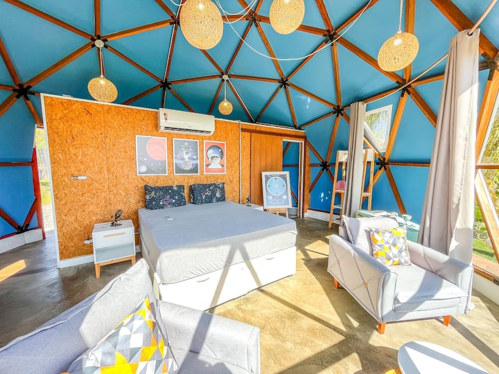 Вторият купол на Eco Glamping Brasil е уникално изживяване, което съчетава комфорт и декорация, вдъхновена от Вселената. С панорамна гледка, която ви свързва със звездите, това място е идеално за двойки в търсене на магически или приключенски моменти, които искат да опознаят красотата на космоса, без да се откажат от уюта.