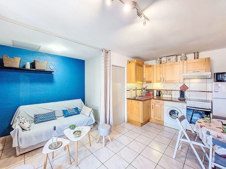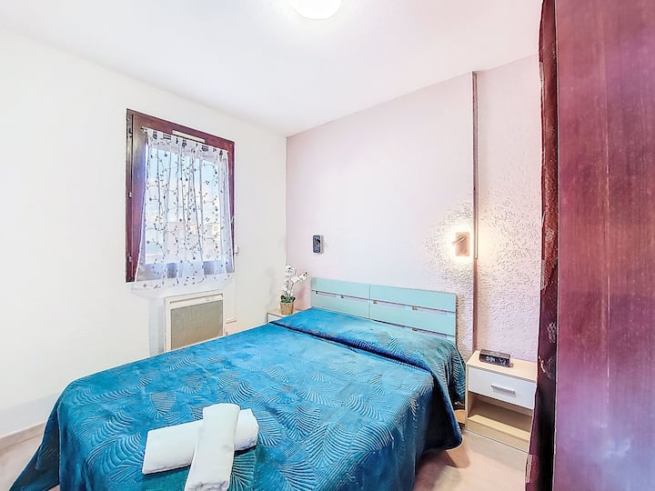 2-стаен апартамент 27 м2 на 2-ри етаж. Всекидневна/трапезария с 1 диван (140 см, дължина 190 см), телевизор (плосък екран), електрическо отопление и климатик. Изход към терасата. 1 стая с 1 френско легло (1 х 140 см, дължина 190 см). Кухненски бокс (4 керамични стъклени котлони, тостер, чайник, микровълнова печка, електрическа кафемашина). Душ/тоалетна.