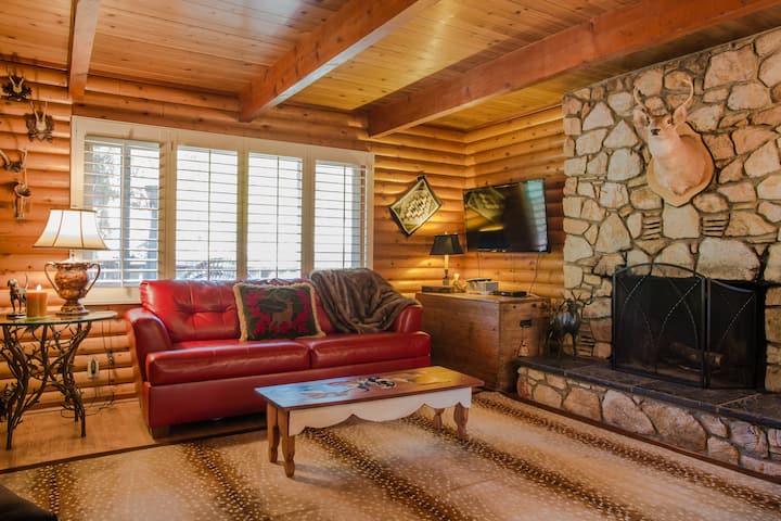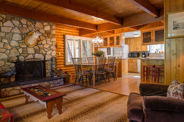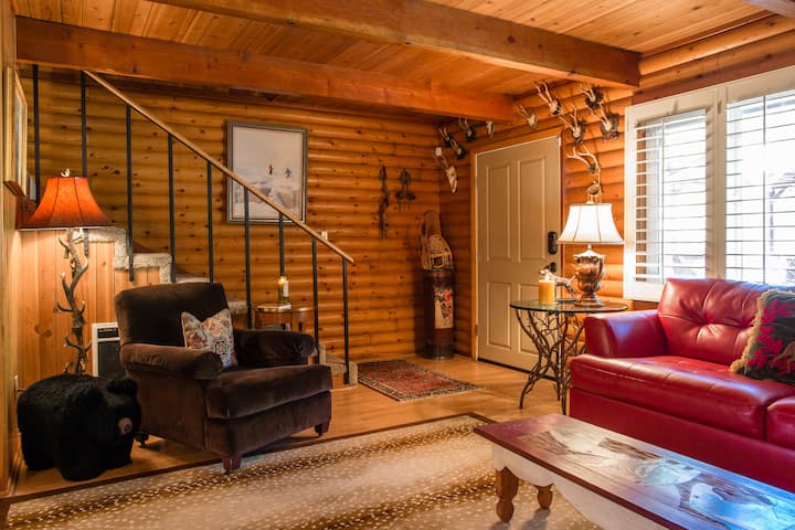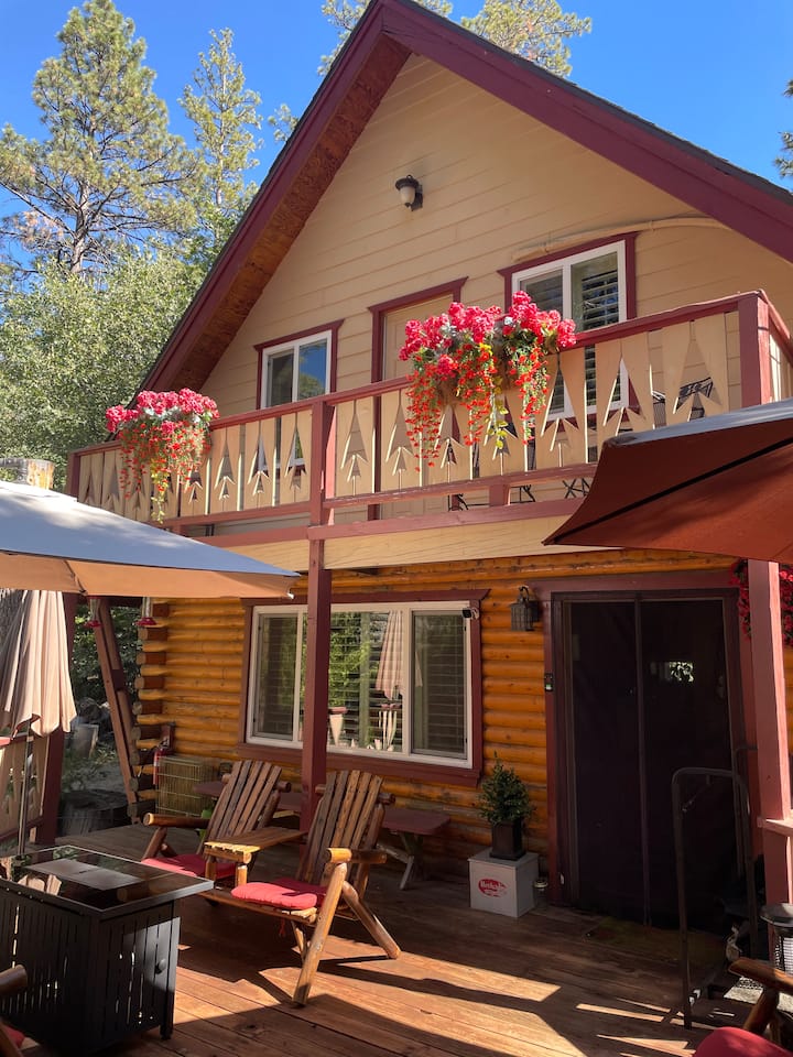 Когато влезете, ще откриете отворена всекидневна с камина, трапезария и кухня. На основния етаж ще намерите и перално помещение с пълен размер, 1/2 баня и голям килер, пълен с игри. През задната врата се вижда веранда, заобиколена от люлякови храсти, борови дървета, хидромасажна вана, места за сядане на открито за 5 души и хидромасажна вана. Нагоре по малко стълбище се намира голямата спалня с удобно легло с кралски размер, огромен таван с дървени греди и капандура, където можете да гледате звездите или да го затворите, за да се затъмни, телевизор и частна външна веранда с невероятен изглед към планината. Втората спалня също е голяма с дървени тавани, електрическа камина, телевизор и голям гардероб. Има голяма баня с отделна зона за сядане, отделен стенен нагревател, когато е хладно, зона за гримиране и душ/вана.