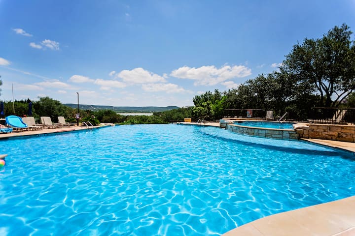 Тази великолепна вила на върха на хълм е заобиколена от спираща дъха гледка към езерото Травис и провинцията. Вилата има лесен достъп до всички удобства на Hollows от инфинити край басейн с изглед към езерото, над 8 мили пътеки за пешеходен туризъм/велосипед/голф количка и фитнес център. Ресторант и бар на място с обслужване край басейна в Beach Club. Вилата разполага със самостоятелен вътрешен двор с изглед към гориста местност. Голф количката е на разположение на гостите под наем. Перфектно място за забавно релаксиращо бягство!