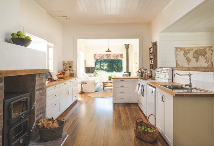 Ако обичате да готвите, ще харесате кухнята на Willow Bend Homestead. Има много тенджери и тигани и страхотна ретро търговска двойна фурна, която някога е била използвана от пекарна/кафене Geeveston. Има и съдомиялна машина. Има тенджера за кафе на котлона (bialetti) - използва еспресо смляно кафе, моля, донесете малко, ако пиете много кафе, но обикновено вече има и малко. Има и кафемашина, донесете си собствени зърна. Опитваме се да се уверим, че са осигурени основните неща, като чай, зехтин, сол и пипер, но с Бруни малко изолиран от магазините, препоръчваме да донесете свои собствени консумативи от континента, ако можете. Има доста добър малък магазин в Adventure Bay, на 20 минути с кола от къщата.
