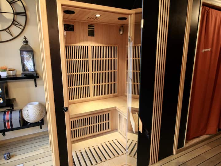 На разположение е стая за релакс със сауна, душ кабина и джакузи, под навес... звездният трезор се свързва с вас с пенливите си ръце.