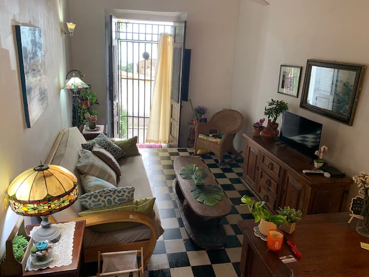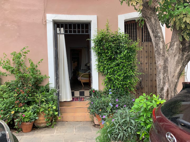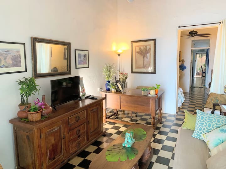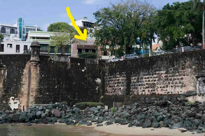 Този апартамент на първия етаж е в реновиран испански колониален дом, датиращ от около 1850 г., когато е добавен втори етаж. Къщата е един от най - старите испански колониални домове в Стария град. Всекидневната и входът са само на около 20 метра от укрепената стена на Стария град. Разстоянието е около 2 1/2 фута над нивото на улицата, което подобрява гледката.