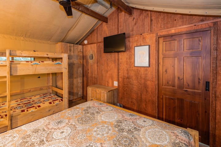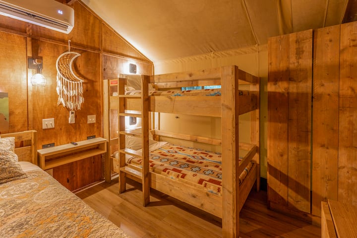 Палатка за сафари за 4 души. Стая с 1 двойно легло и 1 двуетажно легло.