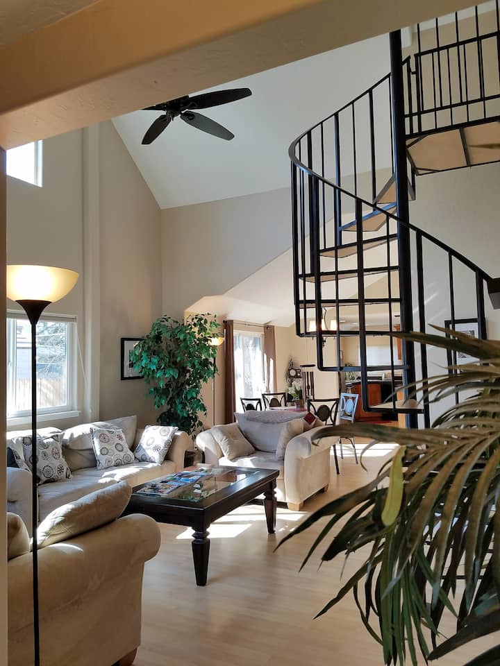 и Trader Joes. Намираме се на 1 миля от езерото Кьор д'Ален. Голям двор, красиви дървета. Задната веранда е обърната на запад, така че можете да се насладите на барбекюто, докато гледате залеза на слънцето. Централен климатик и отопление, за да ви е удобно. Когато влезете, сте в дневната. Вдясно има една спалня. Нагоре по спираловидното стълбище има още една спалня. Продължете направо и ще стигнете до трапезарията, вдясно от която е основната спалня, а ако продължите направо, ще стигнете до кухнята. Хубавото на мястото е, че и двете спални на приземния етаж имат собствена баня!