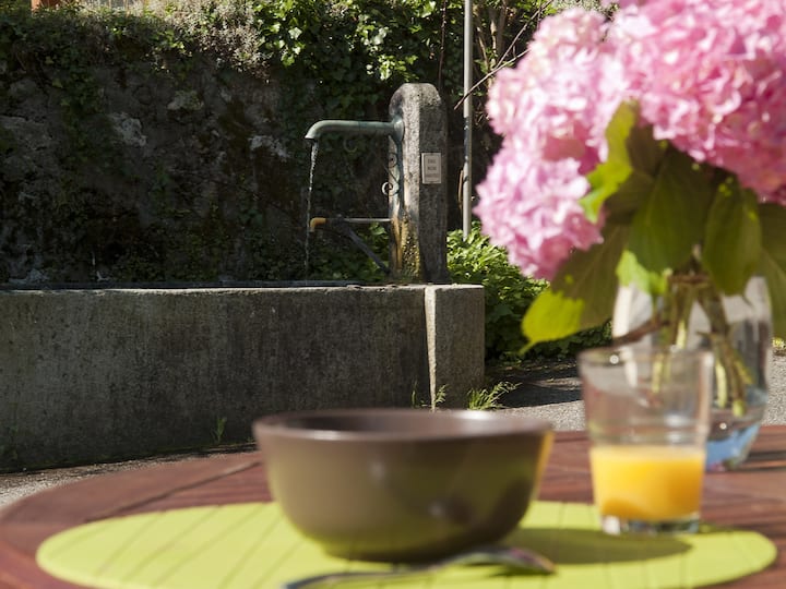Нашата къща в Савоярд, типична от 18 - ти век, ще ви очарова с идеалното си местоположение: на 1,7 км от езерото Анси в сърцето на регионалния парк „Баугес“ и точно пред Масива „Борнес - Аравис “, който можете да видите от градината (165 м²) и терасата (80 м², оборудвани с фонтан).