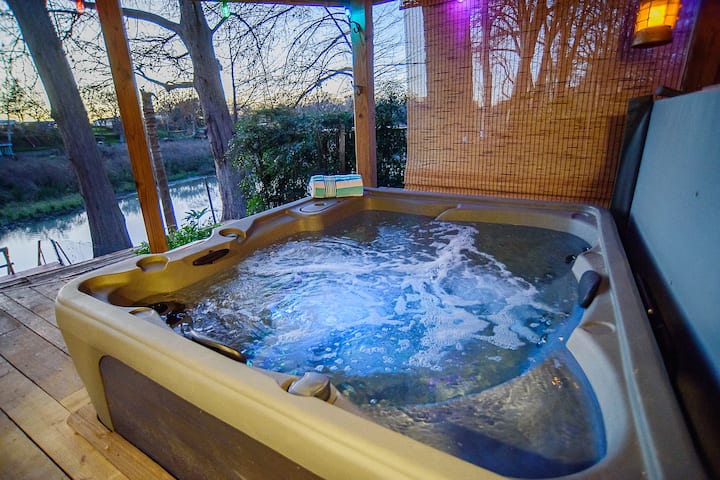 Уединено място с хидромасажна вана на брега на водата, подходящо за домашни любимци