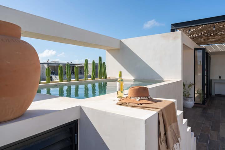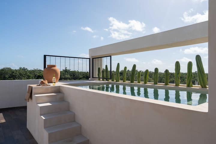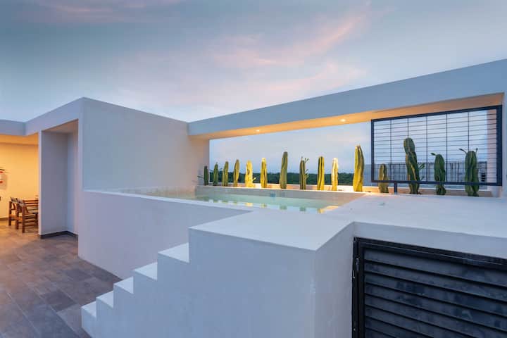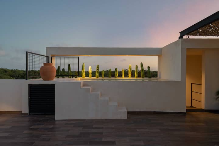 Луксозен оазис с 2 невероятни басейна (1 самостоятелен в огромния ви покрив)! Всичко необходимо и повече за спокойна, релаксираща и автентична кратка почивка в стил „Тулум “. Huge Roof top с невероятен частен басейн, слънчеви легла и трапезария. 3BR's w/comfort 2 суперголеми двойни легла и 2 двойни легла, 3,5 бани. Добре оборудвана кухня, (може да побере 8 души). Разположен в изключителната общност на Aldea Premium (в Алдеа Зама).