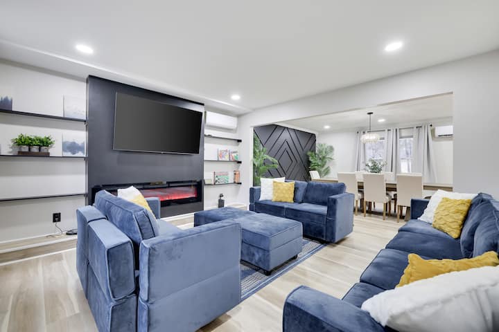 Влизането в дома, точно пред вас има стълби, водещи до втория етаж. Вдясно от вас ще бъде спалнята на 1 - ви етаж. Отляво ще бъде дневната, а право напред ще бъде коридорът, водещ към банята и кухнята на първия етаж. Всекидневната разполага с 65 - инчов смарт телевизор Roku, електрическа камина и рафтове с караоке машина и настолни игри, за да прекарате времето или просто да седнете, да се отпуснете и да усетите атмосферата с приятели и семейство.