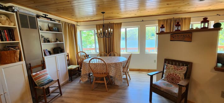 Къща край езеро с плувен сал, огнище, кану и каяци