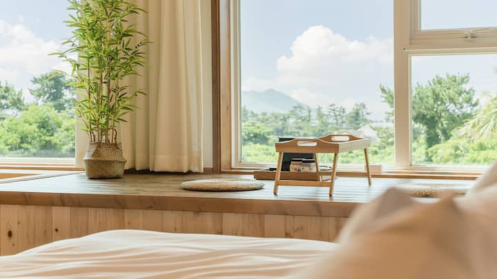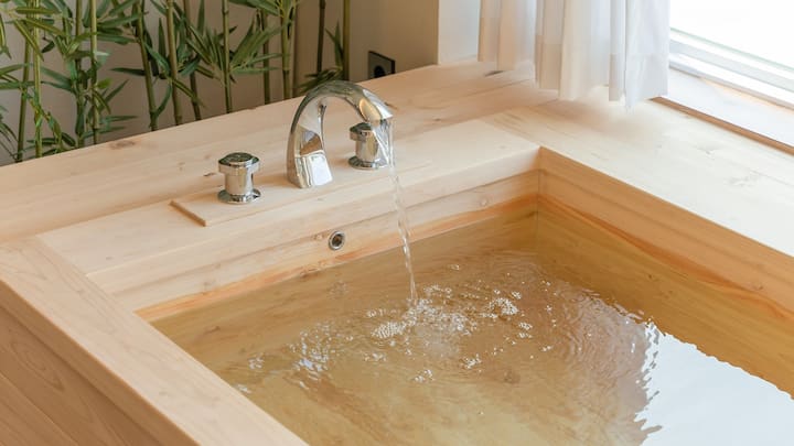 Хинокитанг, прозорец, плоско легло/най-популярната стая с хинокитанг и плоско легло до прозореца