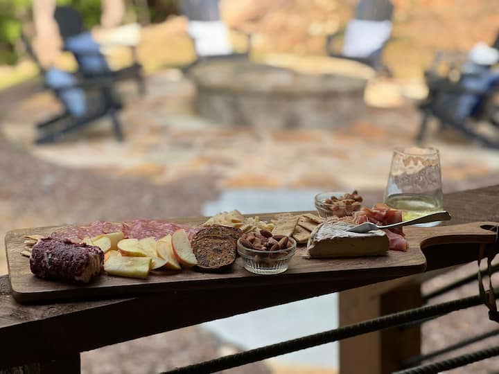 • Трапезария в задния двор за 6 души, огнище, с 6 стола Adirondack, за да можете да седнете до огъня под звездите или красиво осветление в района през нощта, което ви позволява да се наслаждавате на компанията, разговора и пищянията си!