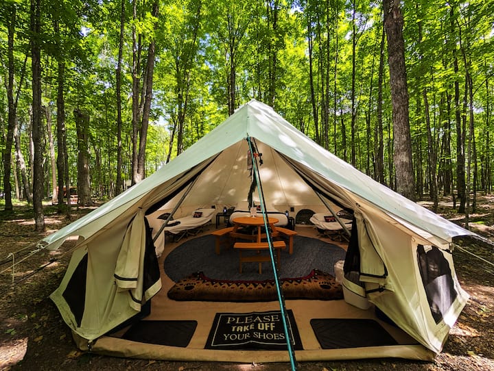 ПРИРОДАТА Е ИЗДИГНАТА. ЕДИН БЕЗПРОБЛЕМЕН ПРЕСТОЙ. ВСЯКО КУРОРТНО УДОБСТВО Е ВКЛЮЧЕНО В ЦЕНАТА. ЕДНА ЦЕНА = ВСИЧКО. БЕЗ ИЗНЕНАДА - ПРИЯТНО ПРЕКАРВАНЕ. | Тази луксозна палатка №6 в канадските граници на Нортуудс ви отвежда надалеч. Места за 6 души с пълноразмерно легло и 4 креватчета с луксозно спално бельо. Зашеметяваща гледка към Нортуудс и кратка разходка до лесен достъп до езеро с пясъчен плаж. Пешеходни пътеки на място, гребла, каяци, канута, игрална зала, универсален магазин и наблюдение на звездите. Предлагат се пакети за отдаване на лодки под наем и романтика. Без домашни любимци или закачалки.