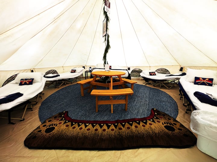 ОПИСАНИЕ НА ОБЕКТА: тази луксозна палатка е оборудвана с пълноразмерно легло, две детски легла и забавна кръгла маса за пикник (с 6 души удобно в палатката). На открито има грил на дървени въглища, светлини на Едисън, маса за пикник и камина. Има и обща газова скара за ползване от гостите (разположена между къмпинги 8 и 9). POV също има дървени люлки и хамаци в целия курорт. Сега, включен в тарифата ви за наем, POV Resort осигурява захранващи станции за всяка луксозна палатка - те осигуряват основно електричество за зареждане на телефони, лаптопи, вентилатори, машини за ХОББ и други уреди с ниска мощност и др. Покритието на земята е мулч - без повече следи от кал! В банята има паркинг за едно превозно средство с препълнен паркинг.