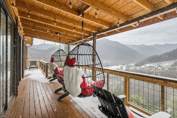Mountain Moonlight от Hearth and Horizon Family Getaways е луксозна хижа в Maggie Valley с 3 спални/2 бани, със зашеметяваща гледка към планината, самостоятелна хидромасажна вана, големи двойни легла и забавна стая за игри. Побира 8 – 10 души и е напълно подходяща за домашни любимци. Само на 1 минута от Soco Road, това уютно място за отдих разполага с просторна тераса с яйцевидни столове с изглед към планините – идеална за сутрешно кафе или релаксация по залез слънце. Идеално за семейства, двойки и малки групи, търсещи комфорт, гледки и удобство.